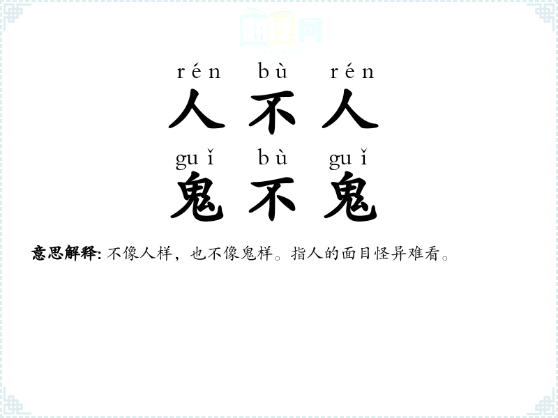 | 人不人,鬼不鬼 | 不像人样,也不像鬼样。指人的面目怪异难看。 |