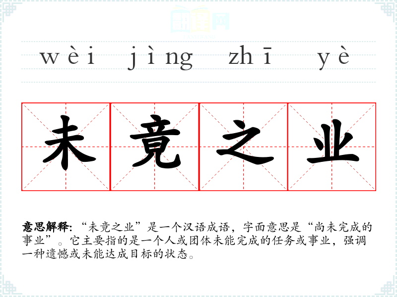 “未竟之业”是一个汉语成语,字面意思是“尚未完成的事业”。它主要指的是一个人或团体未能完成的任务或事业,强调一种遗憾或未能达成目标的状态。