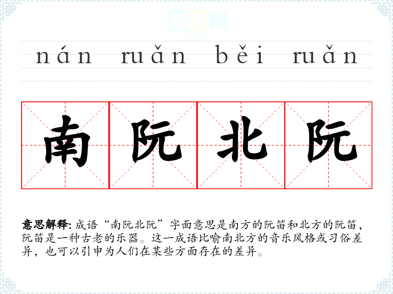 成语“南阮北阮”字面意思是南方的阮笛和北方的阮笛,阮笛是一种古老的乐器。这一成语比喻南北方的音乐风格或*俗差异,也可以引申为人们在某些方面存在的差异。