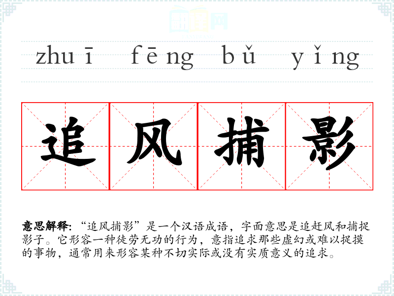 “追风捕影”是一个汉语成语,字面意思是追赶风和捕捉影子。它形容一种徒劳无功的行为,意指追求那些虚幻或难以捉摸的事物,通常用来形容某种不切实际或没有实质意义的追求。