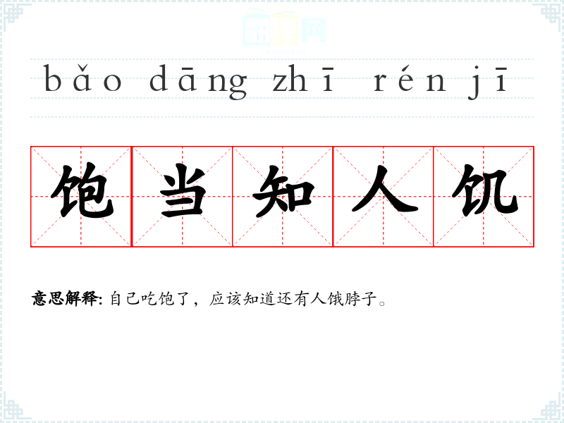 | 饱当知人饥 | 自己吃饱了,应该知道还有人饿脖子。 |
