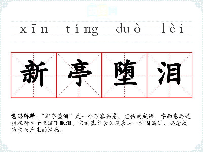 “新亭堕泪”是一个形容伤感、悲伤的成语,字面意思是指在新亭子里流下眼泪。它的基本含义是表达一种因离别、思念或悲伤而产生的情感。
