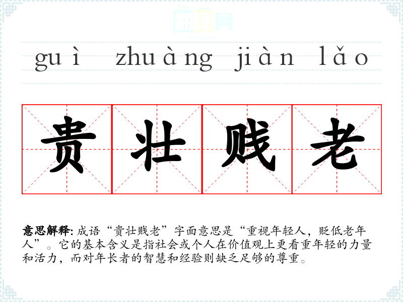 - 同义成语:尊青贱老,强调对年轻人的尊重和对老年人的轻视。
