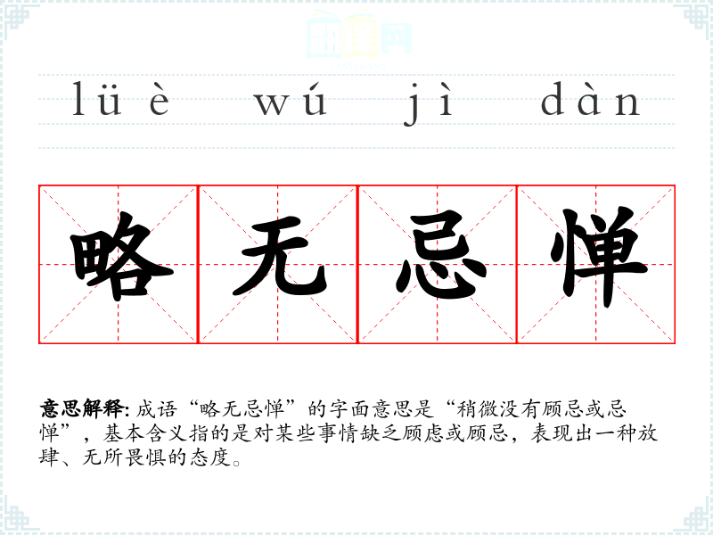 成语“略无忌惮”的字面意思是“稍微没有顾忌或忌惮”,基本含义指的是对某些事情缺乏顾虑或顾忌,表现出一种放肆、无所畏惧的态度。