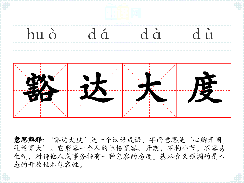 | 大度豁达 | 大度:气量大;豁达:开朗。形容人宽宏开通,有度量,能容人。 |