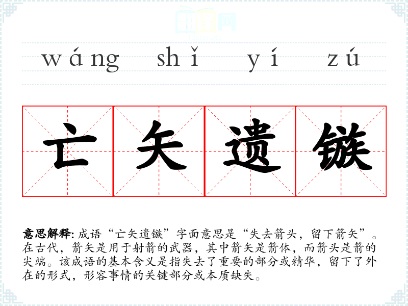 成语“亡矢遗镞”字面意思是“失去箭头,留下箭矢”。在古代,箭矢是用于射箭的武器,其中箭矢是箭体,而箭头是箭的尖端。该成语的基本含义是指失去了重要的部分或精华,留下了外在的形式,形容事情的关键部分或本质缺失。
