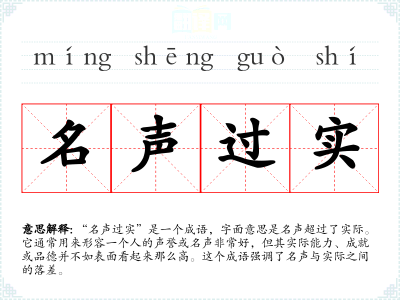 “名声过实”是一个成语,字面意思是名声超过了实际。它通常用来形容一个人的声誉或名声非常好,但其实际能力、成就或品德并不如表面看起来那么高。这个成语强调了名声与实际之间的落差。
