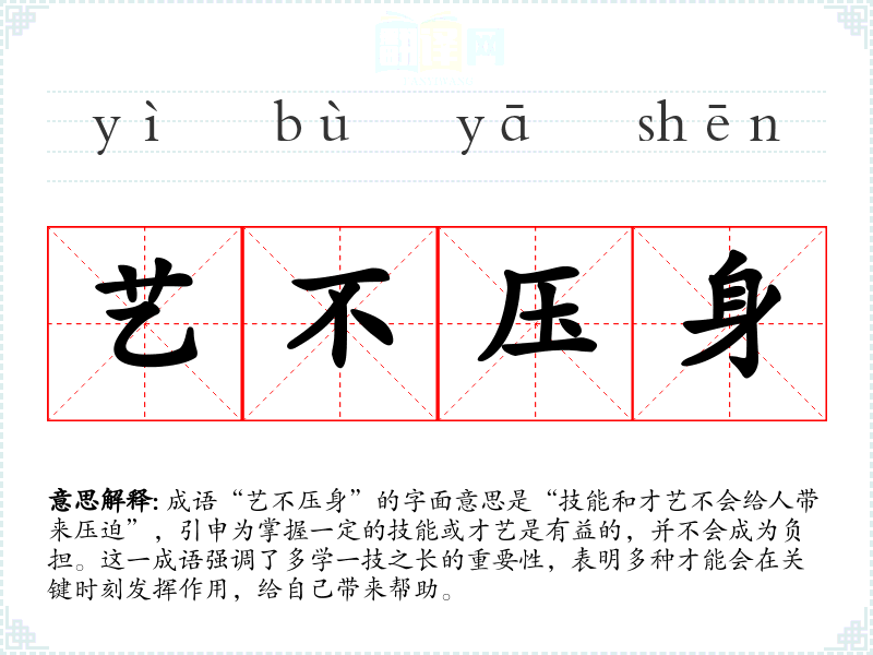 成语“艺不压身”的字面意思是“技能和才艺不会给人带来压迫”,引申为掌握一定的技能或才艺是有益的,并不会成为负担。这一成语强调了多学一技之长的重要性,表明多种才能会在关键时刻发挥作用,给自己带来帮助。