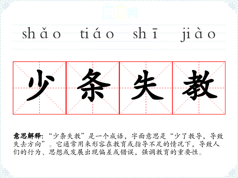 通过对“少条失教”的深入学,我认识到教育不仅是知识的传授,更是道德和方向的引导。这个成语在我语言学和表达中具有重要意义,它提醒我关注教育的力量,以及在与他人沟通时,如何更好地传达教育的重要性。