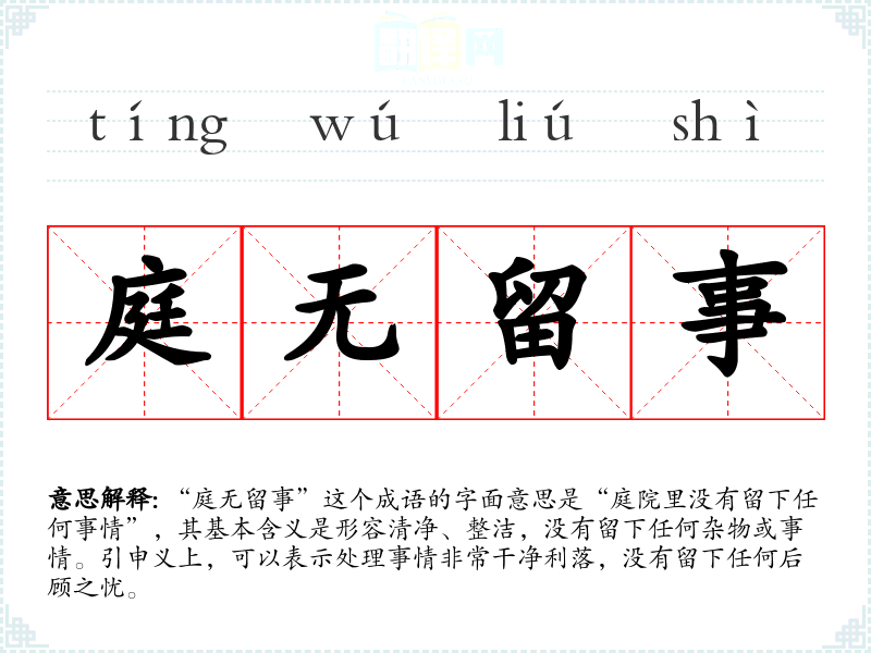 “庭无留事”这个成语的字面意思是“庭院里没有留下任何事情”,其基本含义是形容清净、整洁,没有留下任何杂物或事情。引申义上,可以表示处理事情非常干净利落,没有留下任何后顾之忧。