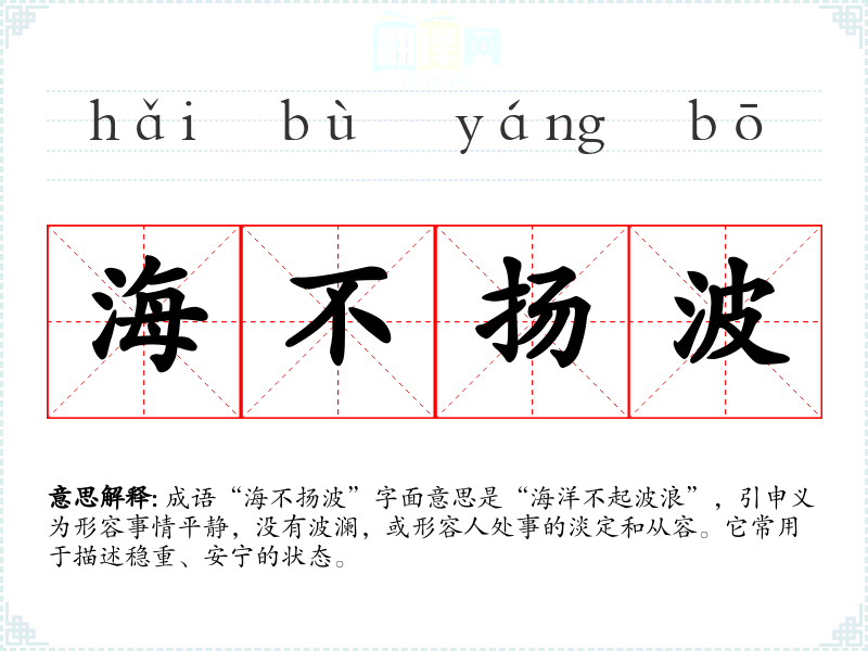 成语“海不扬波”字面意思是“海洋不起波浪”,引申义为形容事情平静,没有波澜,或形容人处事的淡定和从容。它常用于描述稳重、安宁的状态。