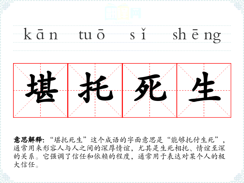 “堪托死生”这个成语的字面意思是“能够托付生死”,通常用来形容人与人之间的深厚情谊,尤其是生死相托、情谊至深的关系。它强调了信任和依赖的程度,通常用于表达对某个人的极大信任。