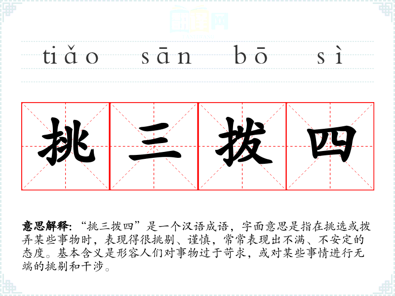 “挑三拨四”是一个汉语成语,字面意思是指在挑选或拨弄某些事物时,表现得很挑剔、谨慎,常常表现出不满、不安定的态度。基本含义是形容人们对事物过于苛求,或对某些事情进行无端的挑剔和干涉。