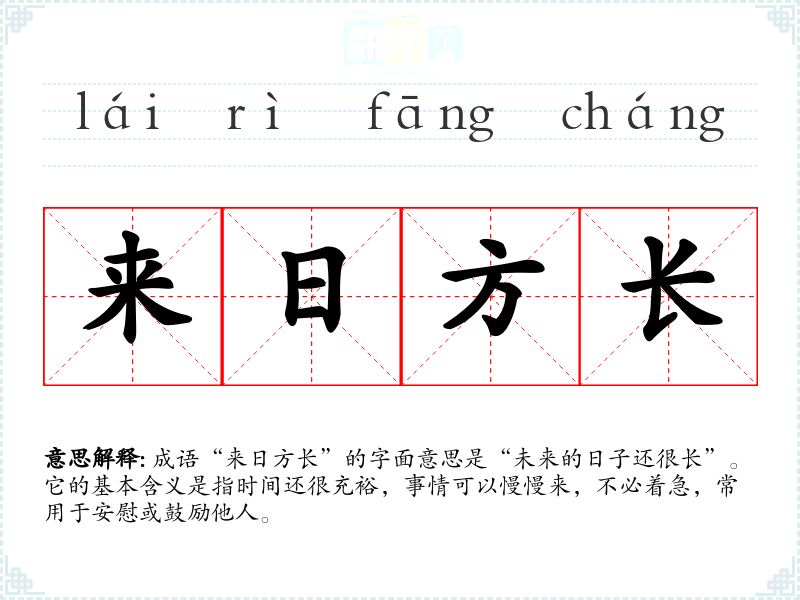 成语“来日方长”的字面意思是“未来的日子还很长”。它的基本含义是指时间还很充裕,事情可以慢慢来,不必着急,常用于安慰或鼓励他人。