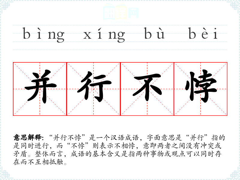 “并行不悖”是一个汉语成语,字面意思是“并行”指的是同时进行,而“不悖”则表示不相悖,意即两者之间没有冲突或矛盾。整体而言,成语的基本含义是指两种事物或观点可以同时存在而不互相抵触。