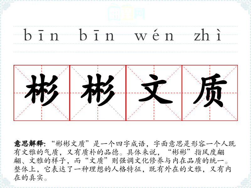 “彬彬文质”是一个四字成语,字面意思是形容一个人既有文雅的气质,又有质朴的品德。具体来说,“彬彬”指风度翩翩、文雅的样子,而“文质”则强调文化修养与内在品质的统一。整体上,它表达了一种理想的人格特征,既有外在的文雅,又有内在的真实。