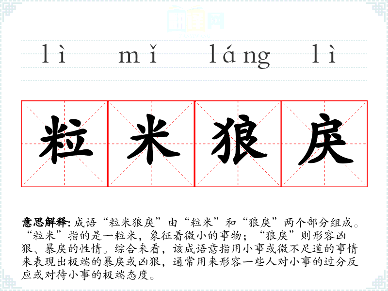 成语“粒米狼戾”由“粒米”和“狼戾”两个部分组成。“粒米”指的是一粒米,象征着微小的事物;“狼戾”则形容凶狠、暴戾的性情。综合来看,该成语意指用小事或微不足道的事情来表现出极端的暴戾或凶狠,通常用来形容一些人对小事的过分反应或对待小事的极端态度。
