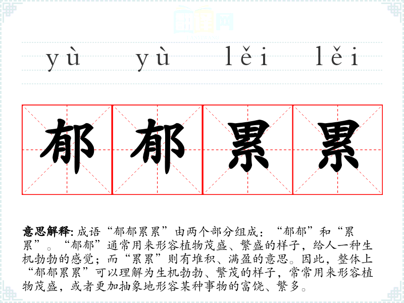 成语“郁郁累累”由两个部分组成:“郁郁”和“累累”。“郁郁”通常用来形容植物茂盛、繁盛的样子,给人一种生机勃勃的感觉;而“累累”则有堆积、满盈的意思。因此,整体上“郁郁累累”可以理解为生机勃勃、繁茂的样子,常常用来形容植物茂盛,或者更加抽象地形容某种事物的富饶、繁多。