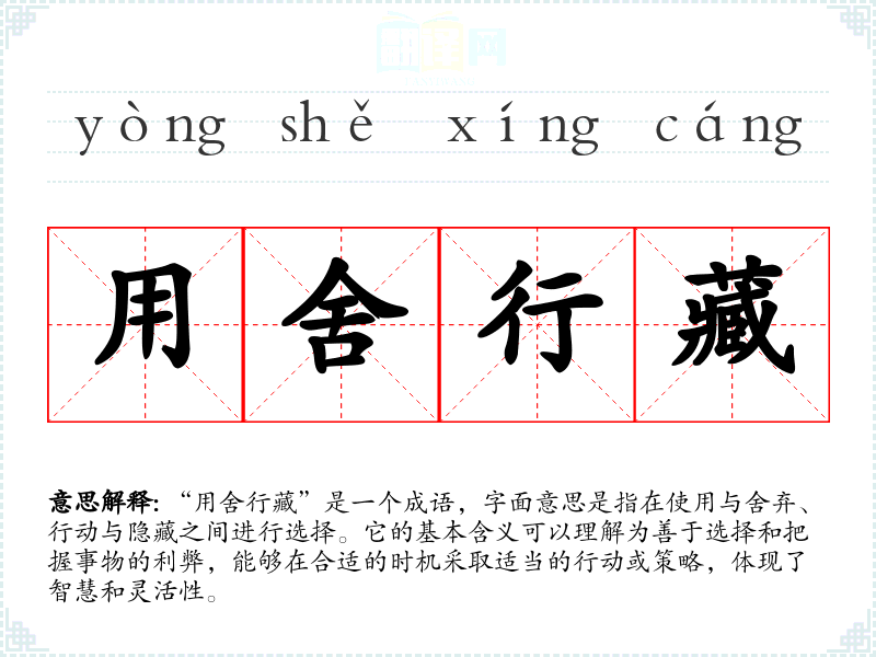 “用舍行藏”是一个成语,字面意思是指在使用与舍弃、行动与隐藏之间进行选择。它的基本含义可以理解为善于选择和把握事物的利弊,能够在合适的时机采取适当的行动或策略,体现了智慧和灵活性。
