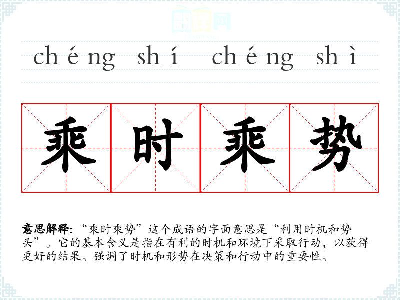 “乘时乘势”这个成语的字面意思是“利用时机和势头”。它的基本含义是指在有利的时机和环境下采取行动,以获得更好的结果。强调了时机和形势在决策和行动中的重要性。