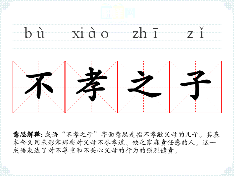 成语“不孝之子”字面意思是指不孝敬父母的儿子。其基本含义用来形容那些对父母不尽孝道、缺乏家庭责任感的人。这一成语表达了对不尊重和不关心父母的行为的强烈谴责。