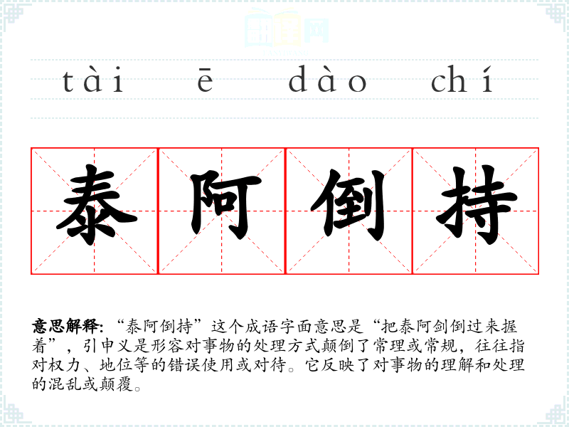“泰阿倒持”这个成语字面意思是“把泰阿剑倒过来握着”,引申义是形容对事物的处理方式颠倒了常理或常规,往往指对权力、地位等的错误使用或对待。它反映了对事物的理解和处理的混乱或颠覆。