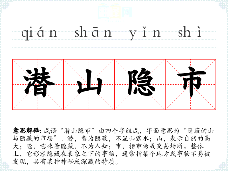 成语“潜山隐市”由四个字组成,字面意思为“隐蔽的山与隐藏的市场”。潜,意为隐蔽,不显山露水;山,表示自然的高大;隐,意味着隐藏,不为人知;市,指市场或交易场所。整体上,它形容隐藏在表象之下的事物,通常指某个地方或事物不易被发现,具有某种神秘或深藏的特质。