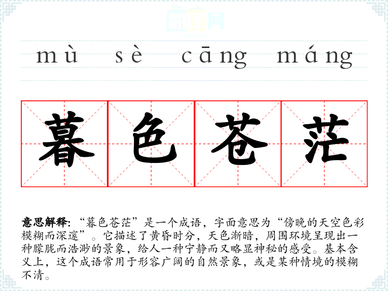 - 日常对话:表达对某种情绪或氛围的描述,比如“这个地方在暮色苍茫时显得更加宁静”。