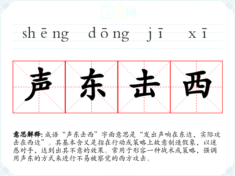 成语“声东击西”字面意思是“发出声响在东边,实际攻击在西边”。其基本含义是指在行动或策略上故意制造假象,以迷惑对手,达到出其不意的效果。常用于形容一种战术或策略,强调用声东的方式来进行不易被察觉的西方攻击。