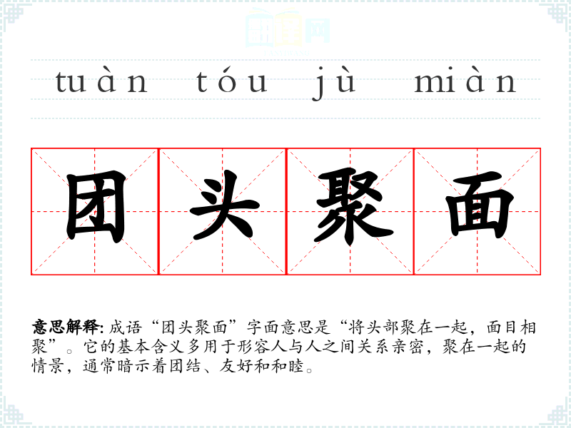 成语“团头聚面”字面意思是“将头部聚在一起,面目相聚”。它的基本含义多用于形容人与人之间关系亲密,聚在一起的情景,通常暗示着团结、友好和和睦。