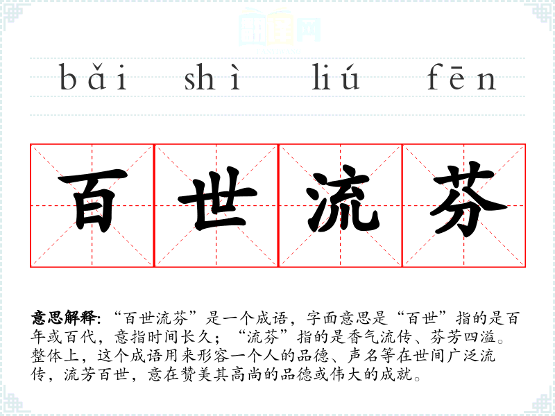 - 流芳百世:强调美德或声名在多代人中流传,几乎与“百世流芬”同义。