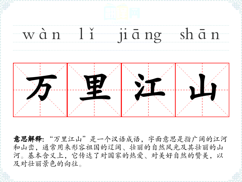 “万里江山”并不是指一个具体的历史典故,而是源于古代文人对自然景观的描绘和赞美。它的构成可以追溯到古代诗词中,许多文人墨客通过描绘江山的壮丽景色,抒发对祖国的热爱和对自然的赞美,这种情感在诗歌中得到了充分体现。