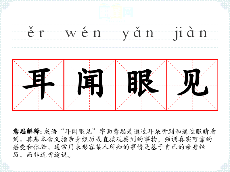 “耳闻眼见”这一成语的来源并没有明确的历史典故,但其构成的词汇在古代文献中较为常见。类似的表达在《论语》中曾提到,强调对事物的真实体验和观察的重要性。成语的形成反映了对真实和信任的重视,在传统文化中,亲身经历往往被视为获取知识和真理的重要途径。