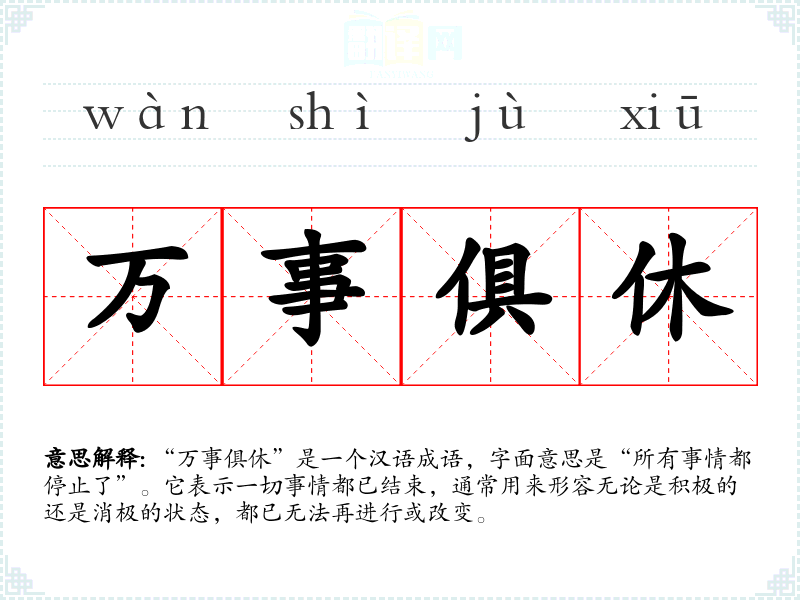 “万事俱休”是一个汉语成语,字面意思是“所有事情都停止了”。它表示一切事情都已结束,通常用来形容无论是积极的还是消极的状态,都已无法再进行或改变。