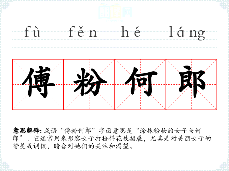 成语“傅粉何郎”字面意思是“涂抹粉妆的女子与何郎”。它通常用来形容女子打扮得花枝招展,尤其是对美丽女子的赞美或调侃,暗含对她们的关注和渴望。