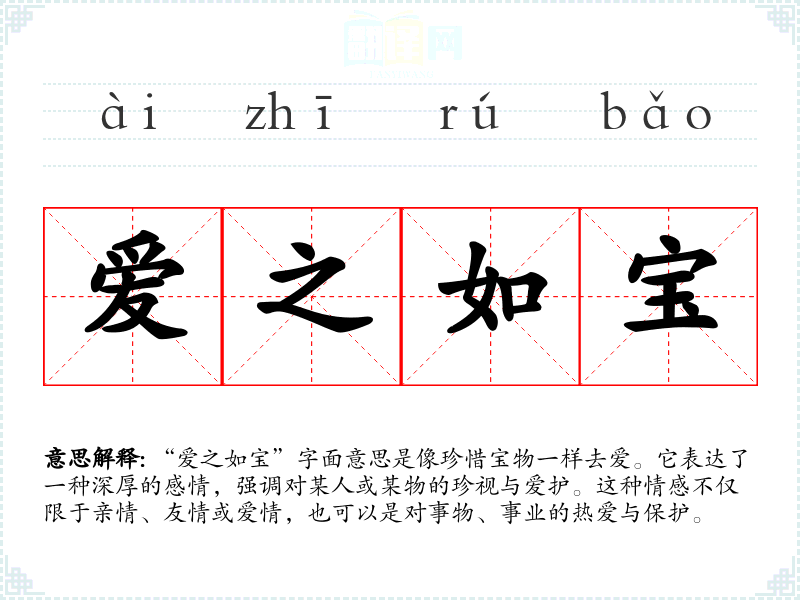 “爱之如宝”字面意思是像珍惜宝物一样去爱。它表达了一种深厚的感情,强调对某人或某物的珍视与爱护。这种情感不仅限于亲情、友情或爱情,也可以是对事物、事业的热爱与保护。