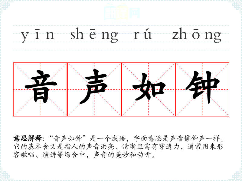 “音声如钟”是一个成语,字面意思是声音像钟声一样。它的基本含义是指人的声音洪亮、清晰且富有穿透力,通常用来形容歌唱、演讲等场合中,声音的美妙和动听。
