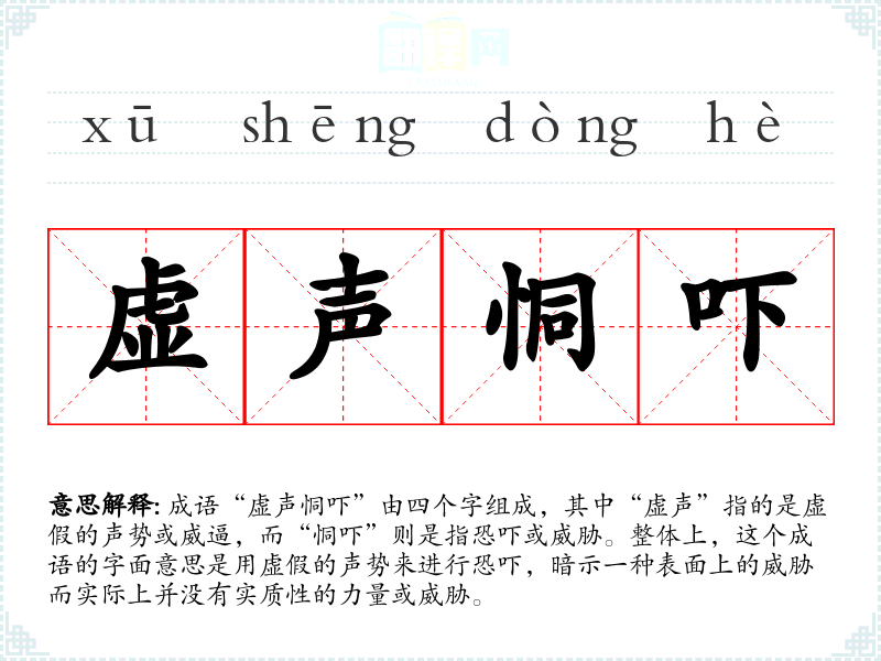 成语“虚声恫吓”由四个字组成,其中“虚声”指的是虚假的声势或威逼,而“恫吓”则是指恐吓或威胁。整体上,这个成语的字面意思是用虚假的声势来进行恐吓,暗示一种表面上的威胁而实际上并没有实质性的力量或威胁。