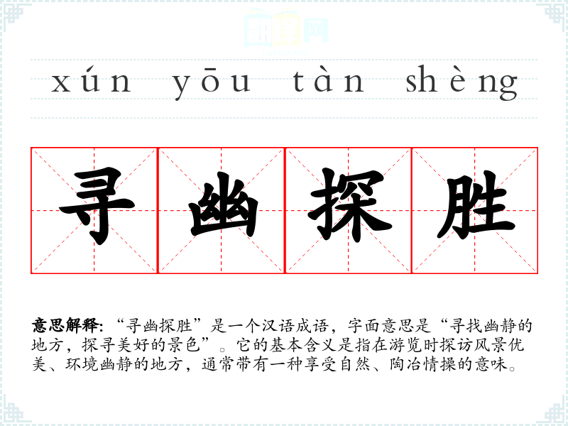 “寻幽探胜”是一个汉语成语,字面意思是“寻找幽静的地方,探寻美好的景色”。它的基本含义是指在游览时探访风景优美、环境幽静的地方,通常带有一种享受自然、陶冶情操的意味。