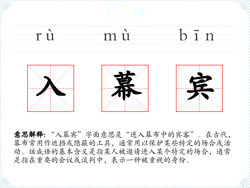 “入幕宾”源于古代的礼仪文化。在古代,贵族和官员在举行重要会议或活动时,常常会设立专门的幕布来划定空间。在这种情况下,被邀请的宾客进入幕中,象征着受到了重视和尊重。具体的文献记载较少,但可以推断该成语反映了古代社会对礼仪与地位的重视。
