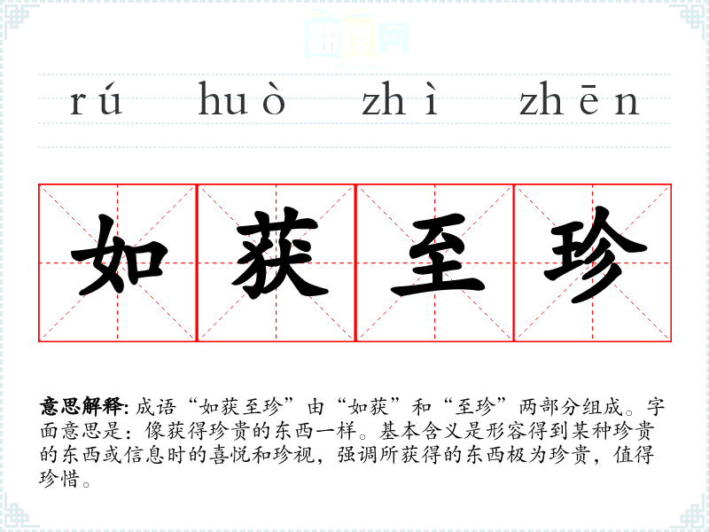 成语“如获至珍”由“如获”和“至珍”两部分组成。字面意思是:像获得珍贵的东西一样。基本含义是形容得到某种珍贵的东西或信息时的喜悦和珍视,强调所获得的东西极为珍贵,值得珍惜。