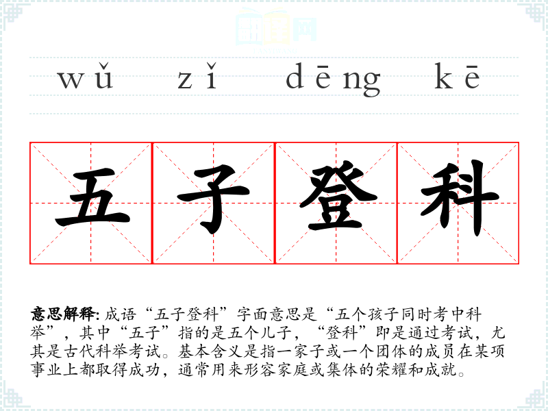 成语“五子登科”字面意思是“五个孩子同时考中科举”,其中“五子”指的是五个儿子,“登科”即是通过考试,尤其是古代科举考试。基本含义是指一家子或一个团体的成员在某项事业上都取得成功,通常用来形容家庭或集体的荣耀和成就。