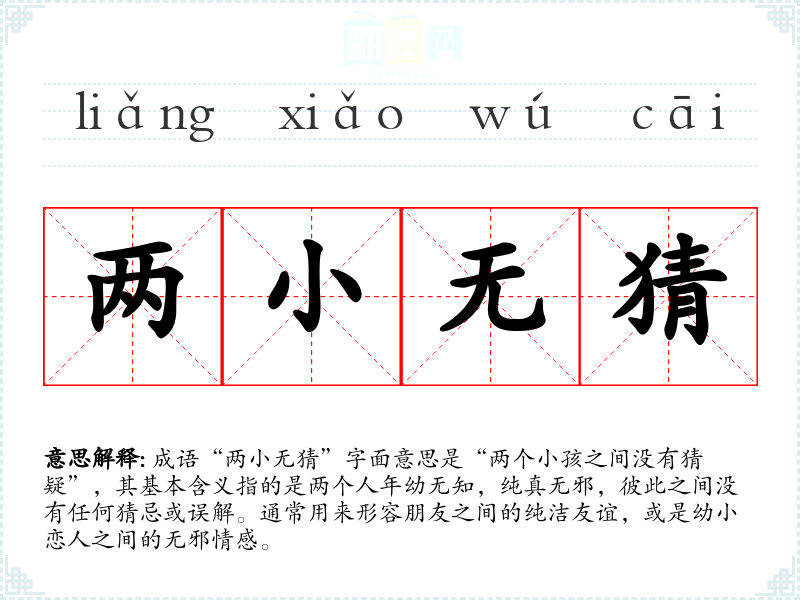 成语“两小无猜”字面意思是“两个小孩之间没有猜疑”,其基本含义指的是两个人年幼无知,纯真无邪,彼此之间没有任何猜忌或误解。通常用来形容朋友之间的纯洁友谊,或是幼小恋人之间的无邪情感。