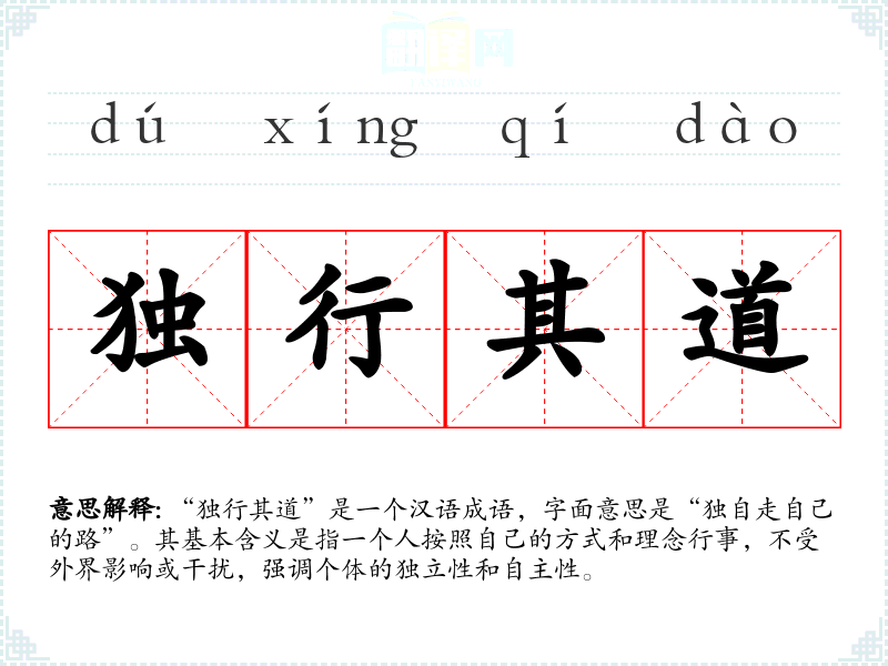“独行其道”是一个汉语成语,字面意思是“独自走自己的路”。其基本含义是指一个人按照自己的方式和理念行事,不受外界影响或干扰,强调个体的独立性和自主性。