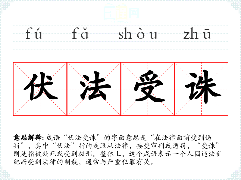 成语“伏法受诛”的字面意思是“在法律面前受到惩罚”,其中“伏法”指的是服从法律,接受审判或惩罚,“受诛”则是指被处死或受到极刑。整体上,这个成语表示一个人因违法乱纪而受到法律的制裁,通常与严重犯罪有关。