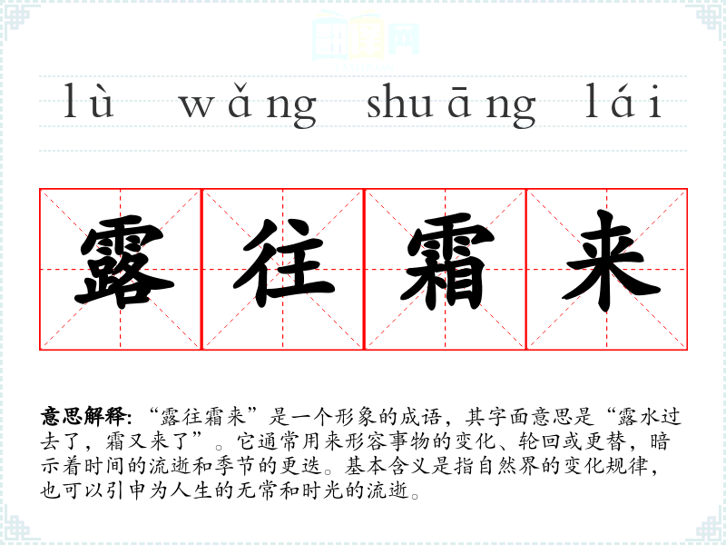 - “一成不变”:形容事物没有变化,与“露往霜来”形成对比。