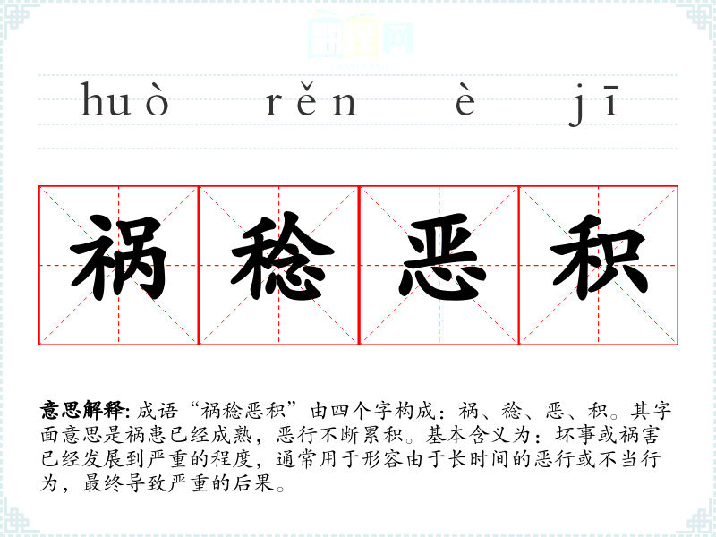 成语“祸稔恶积”由四个字构成:祸、稔、恶、积。其字面意思是祸患已经成熟,恶行不断累积。基本含义为:坏事或祸害已经发展到严重的程度,通常用于形容由于长时间的恶行或不当行为,最终导致严重的后果。