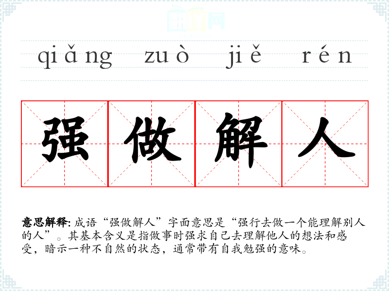 成语“强做解人”字面意思是“强行去做一个能理解别人的人”。其基本含义是指做事时强求自己去理解他人的想法和感受,暗示一种不自然的状态,通常带有自我勉强的意味。