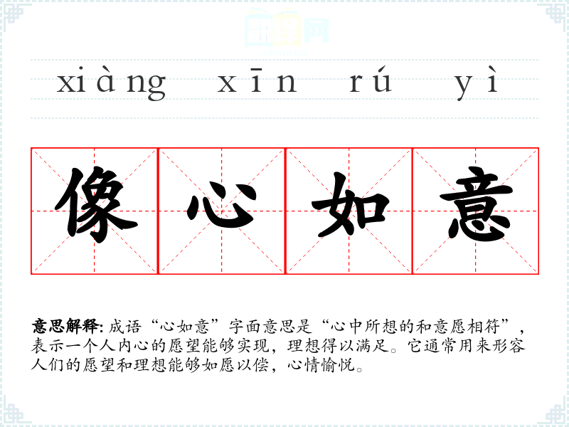 成语“心如意”字面意思是“心中所想的和意愿相符”,表示一个人内心的愿望能够实现,理想得以满足。它通常用来形容人们的愿望和理想能够如愿以偿,心情愉悦。