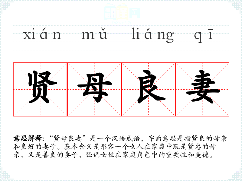 | 贤母良妻 | 对丈夫是贤惠的妻子,对子女是慈善的母亲。 |